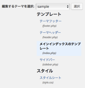 まずは新たに header.php/sidebar.php/footer.php の3つのテンプレートファイルを用意して、index.phpのあるテーマディレクトリ(/wp-content/themes/sample/以下)にアップロードして下さい。これらのテンプレートは、モジュールテンプレートと呼びます。外観>テーマの編集で見てみるとテーマフッターやテーマヘッダーのように認識されていることが分かります。
